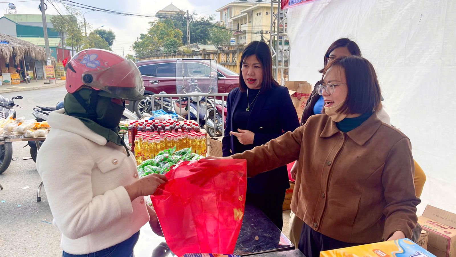 Đồng chí Chủ tịch UBND phường trao quà cho hộ nghèo tại gian hàng 0 đồng.