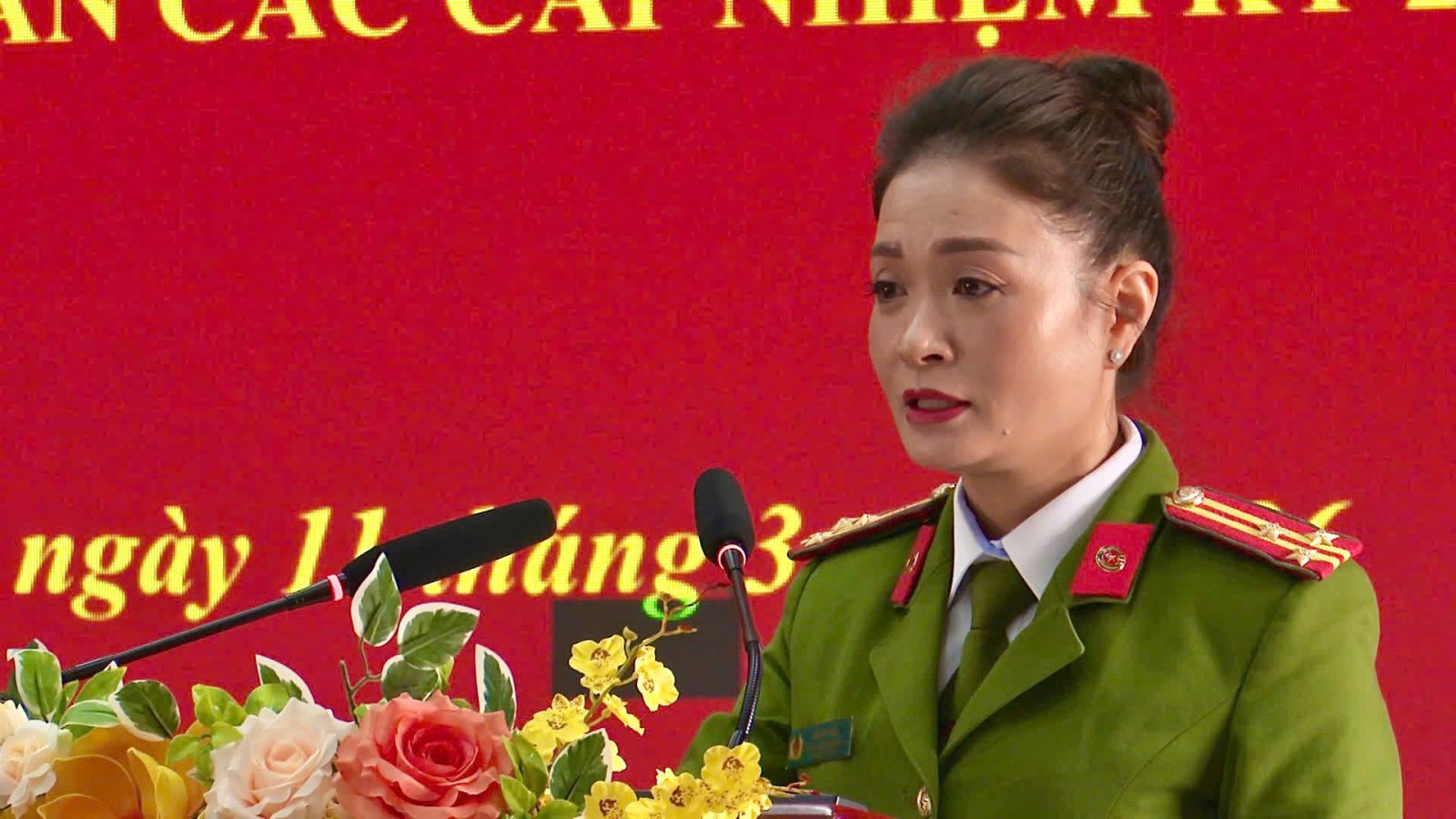 Thượng tá Bùi Thị Nga - Phó trưởng phòng PC06 Công an tỉnh Lai Châu, phát biểu tại hội nghị.