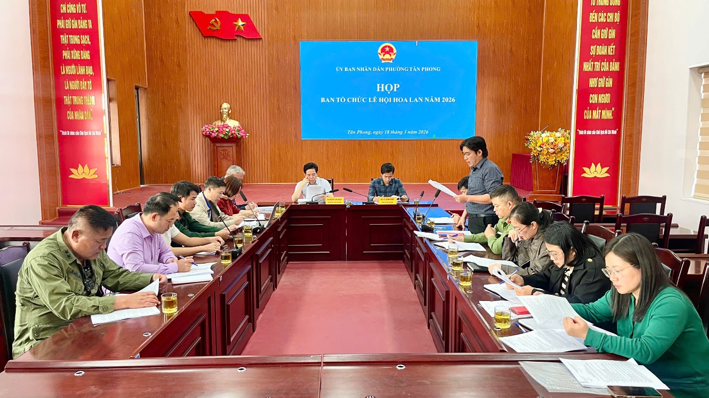 Chiều ngày 18/3, UBND phường Tân Phong tổ chức Họp Ban tổ chức Lễ hội hoa lan phường Tân Phong năm 2026. Dự và chỉ đạo cuộc họp có đồng chí Nguyễn Văn Nghiệp – Phó Bí thư Đảng uỷ, Chủ tịch UBND phường, Lê Xuân Dũng – Uỷ viên BTV, Phó Chủ tịch UBND phường. Dự cuộc họp còn có lãnh đạo các phòng chuyên môn, cơ quan, đơn vị phường; đại diện Hội sinh vật cảnh tỉnh Lai Châu; Câu lạc bộ hoa lan Lai Châu; Câu lạc bộ hoa, cây cảnh Lai Châu.