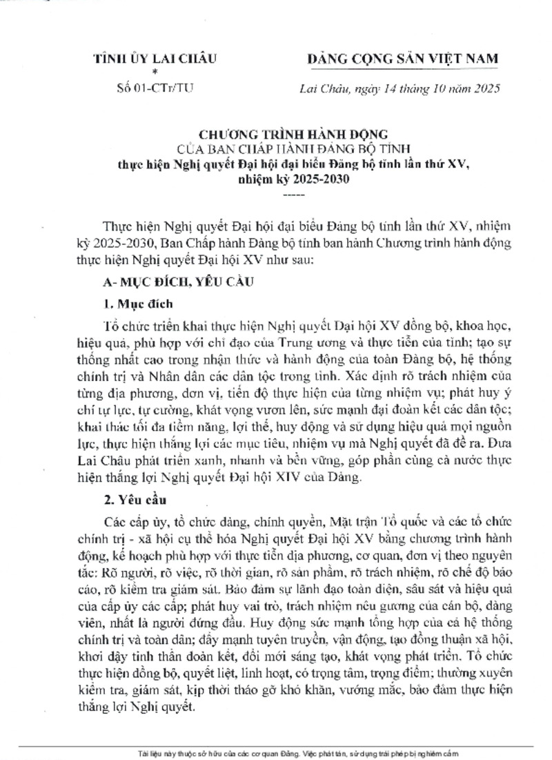 | Tiêu đề văn bản | CHƯƠNG TRÌNH HÀNH ĐỘNG CỦA BAN CHẤP HÀNH ĐẢNG BỘ TỈNH thực hiện Nghị quyết Đại hội đại biểu Đảng bộ tỉnh lần thứ XV, nhiệm kỳ 2025 -2030 | ||