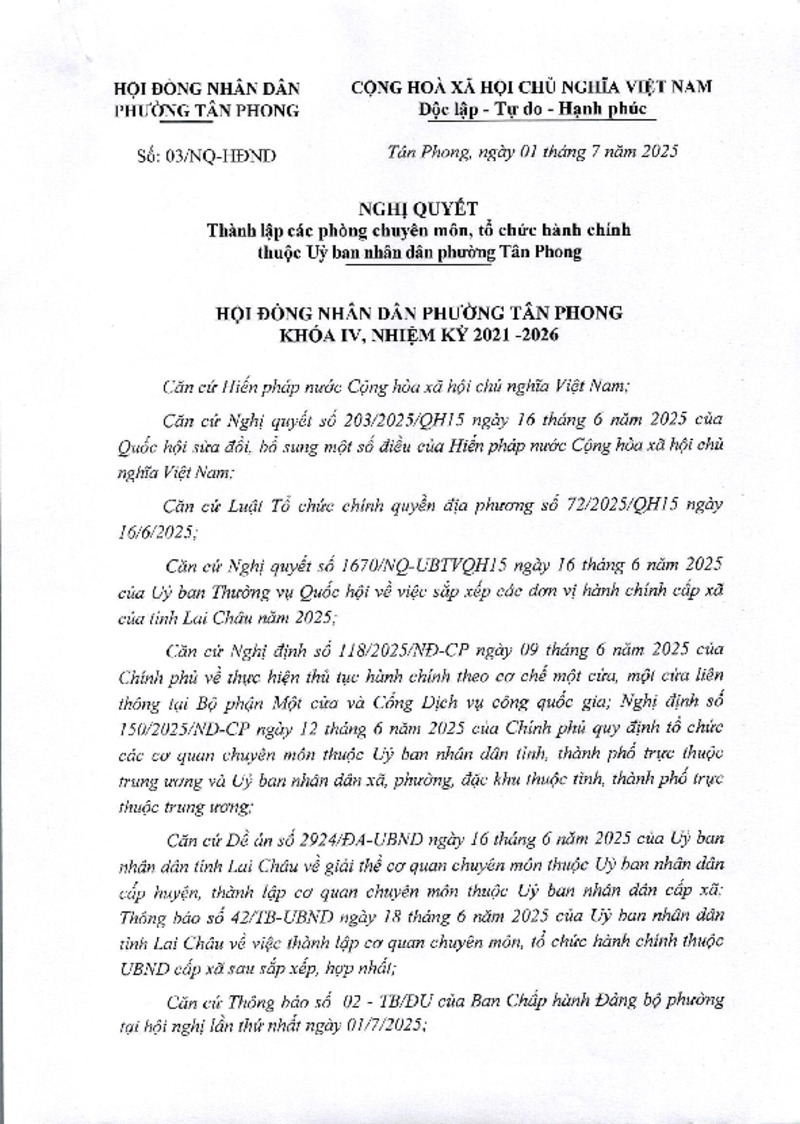 | Tiêu đề văn bản | Nghị quyết thành lập các phòng chuyên môn, tổ chức hành chính thuộc UBND phường Tân Phong | ||