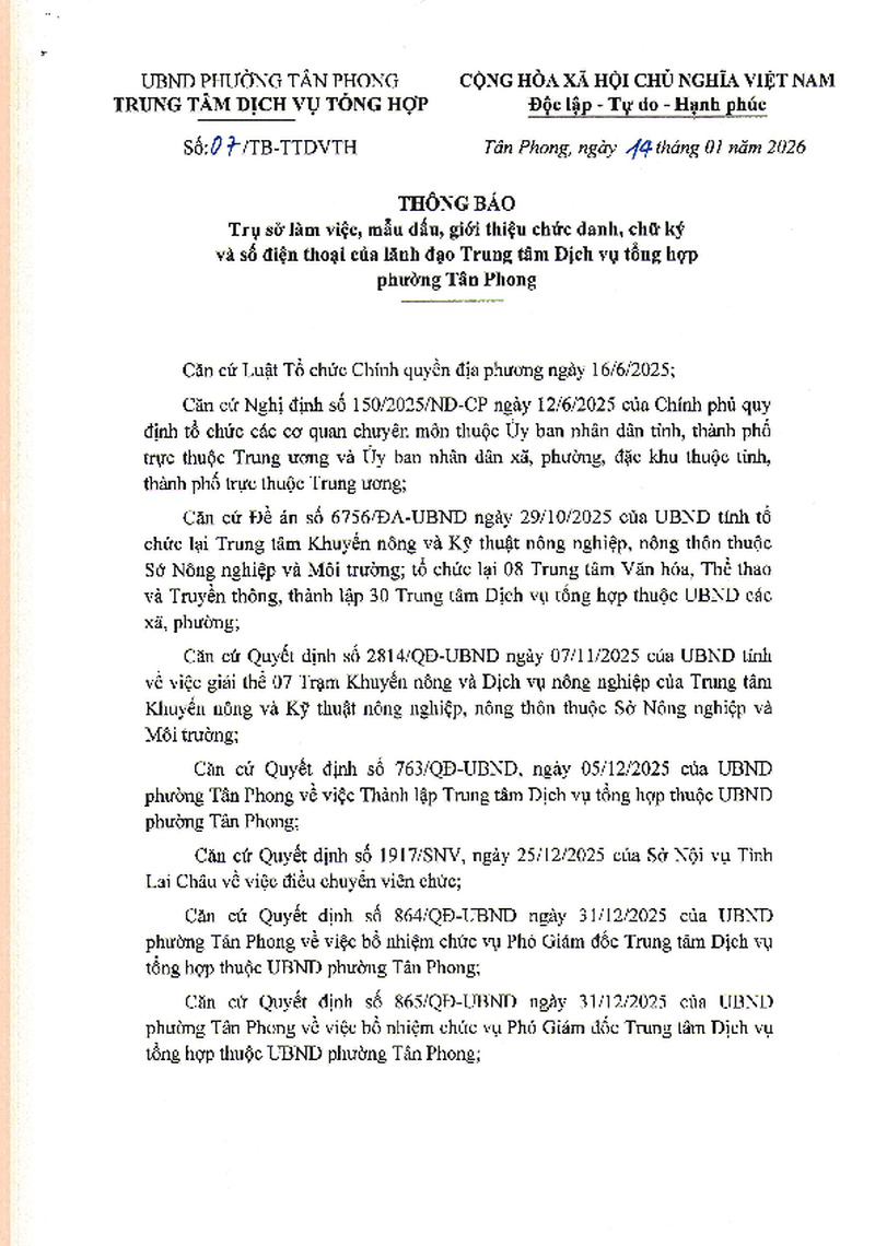 | Tiêu đề văn bản | Thông báo trụ sở làm việc, mẫu dấu, giới thiệu chức danh, chữ ký và số điện thoại của lãnh đạo Trung tâm Dịch vụ tổng hợp phường Tân Phong | ||