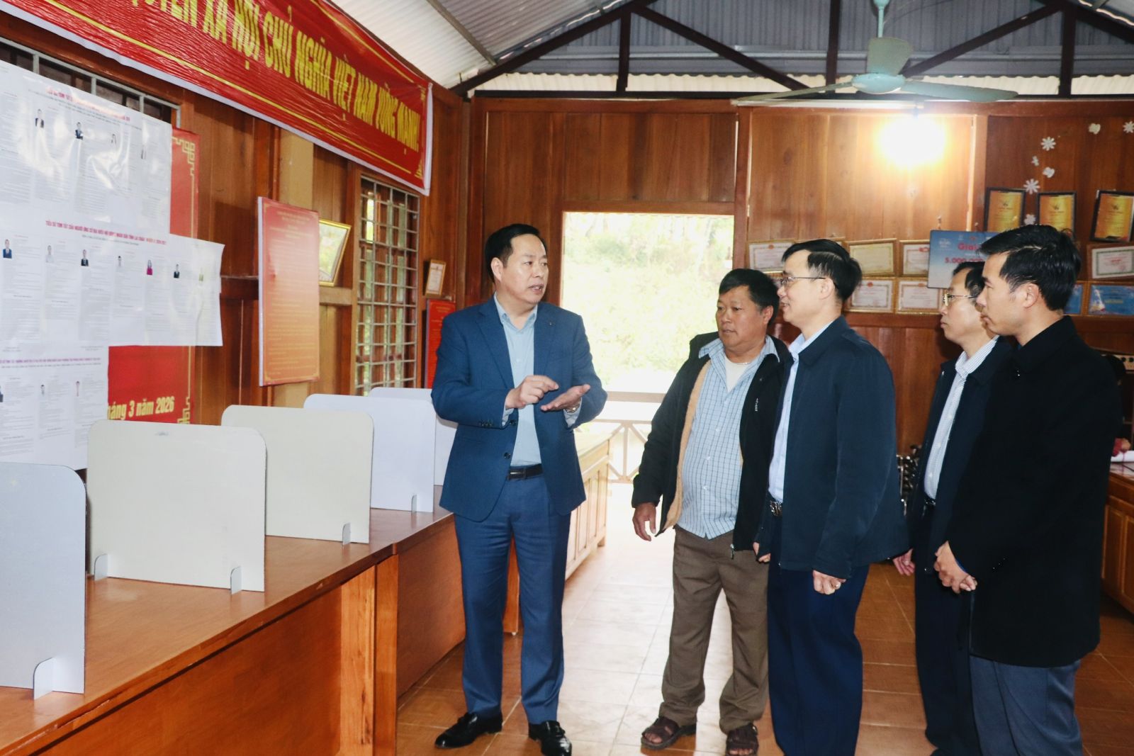 Chủ tịch UBND tỉnh đã trực tiếp kiểm tra khu vực bỏ phiếu tại các tổ dân phố: Lao Tỷ Phùng, Sáy San 1, Sáy San 3, Nùng Nàng và tổ 19. Sau khi nghe đại diện các Tổ bầu cử và những người có uy tín báo cáo về tiến độ công tác chuẩn bị đến thời điểm hiện tại, đồng chí Chủ tịch UBND tỉnh đã tiến hành rà soát chi tiết các khâu từ trang trí khánh tiết, niêm yết danh sách cử tri, tiểu sử những người ứng cử đến việc chuẩn bị hòm phiếu, con dấu và công tác phát thẻ cử tri cho Nhân dân.