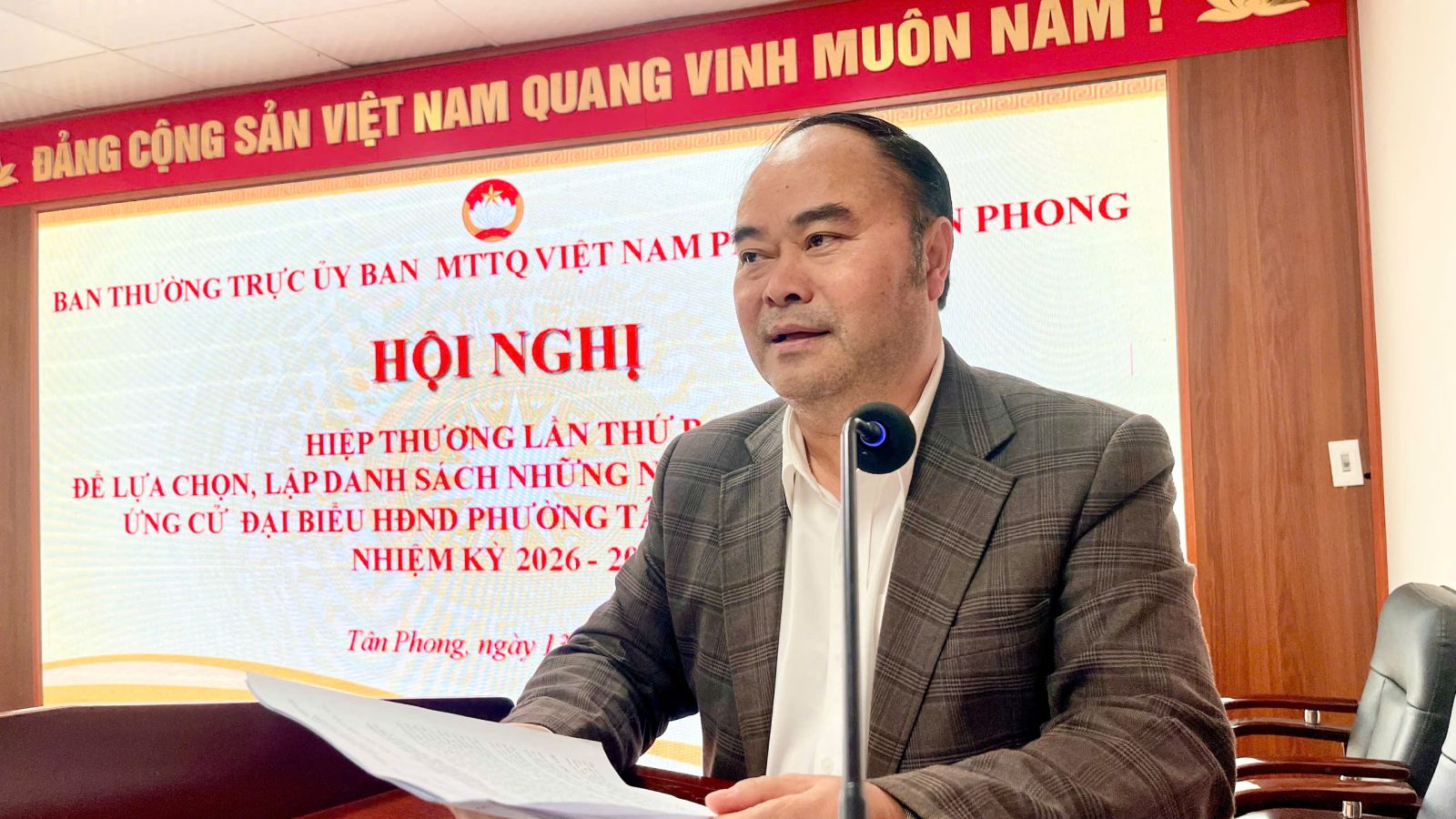 Sáng ngày, 13/02, Ban Thường trực Uỷ ban MTTQ Việt Nam phường Tân Phong  tổ chức Hội nghị hiệp thương lần thứ ba để lựa chọn, lập danh sách những người đủ tiêu chuẩn ứng cử đại biểu Hội đồng Nhân phường khóa V, nhiệm kỳ 2026 – 2031. Dự và chỉ đạo hội nghị có đồng chí Mùa A Trừ - Tỉnh uỷ viên, Bí thư Đảng uỷ, Chủ tịch HĐND phường. Đại diện Ủy ban Bầu cử phường, Thường trực Hội đồng Nhân dân, Ủy ban Nhân dân; Đại diện Ban xây dựng Đảng Đảng ủy; Ban Thường trực Ủy ban MTTQ Việt Nam phường; lãnh đạo các tổ chức thành viên Ủy ban MTTQ Việt Nam phường; lãnh đạo Phòng Văn hóa - Xã hội phường.
