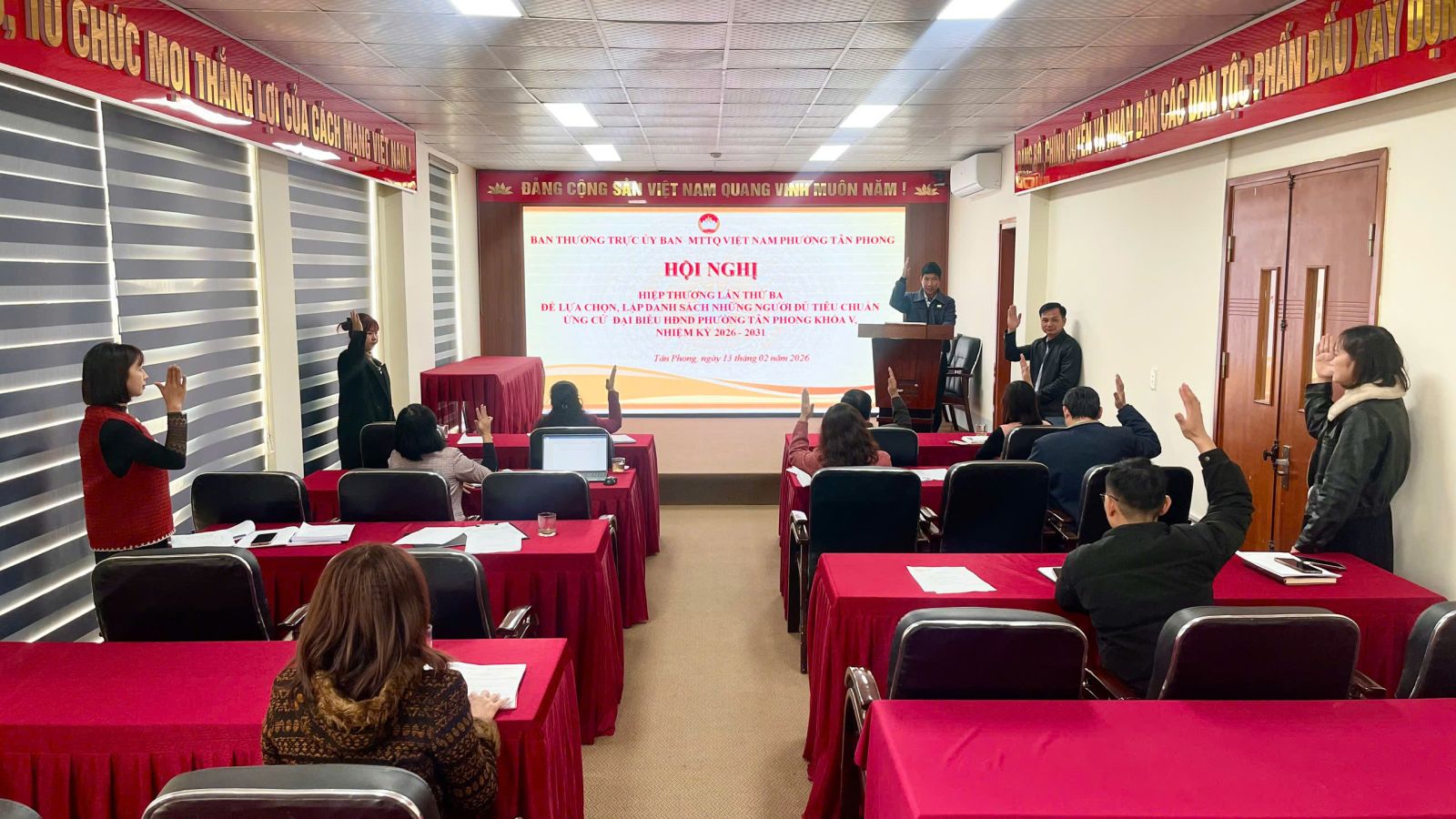 Hội nghị đã biểu quyết thông qua biên bản và danh sách những người đủ ứng cử đại biểu HĐND phường khóa V, nhiệm kỳ 2026 – 2031, kết quả 100% đại biểu quyết nhất trí danh sách 37 người ứng cử đại biểu Hội đồng nhân dân phường Tân Phong khóa V, nhiệm kỳ 2026.
