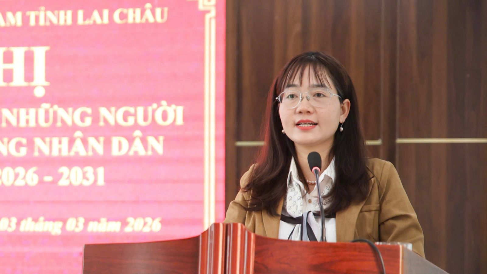 Bà Phạm Thị Hà - Giám đốc Hợp tác xã An Ngân, người ứng cử đại biểu HĐND phường Tân Phong nhiệm kỳ 2026-2031 trình bày chương trình hành động tại hội nghị.