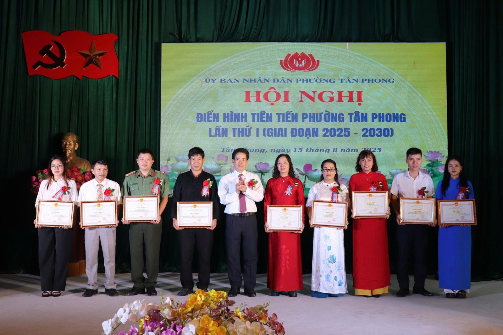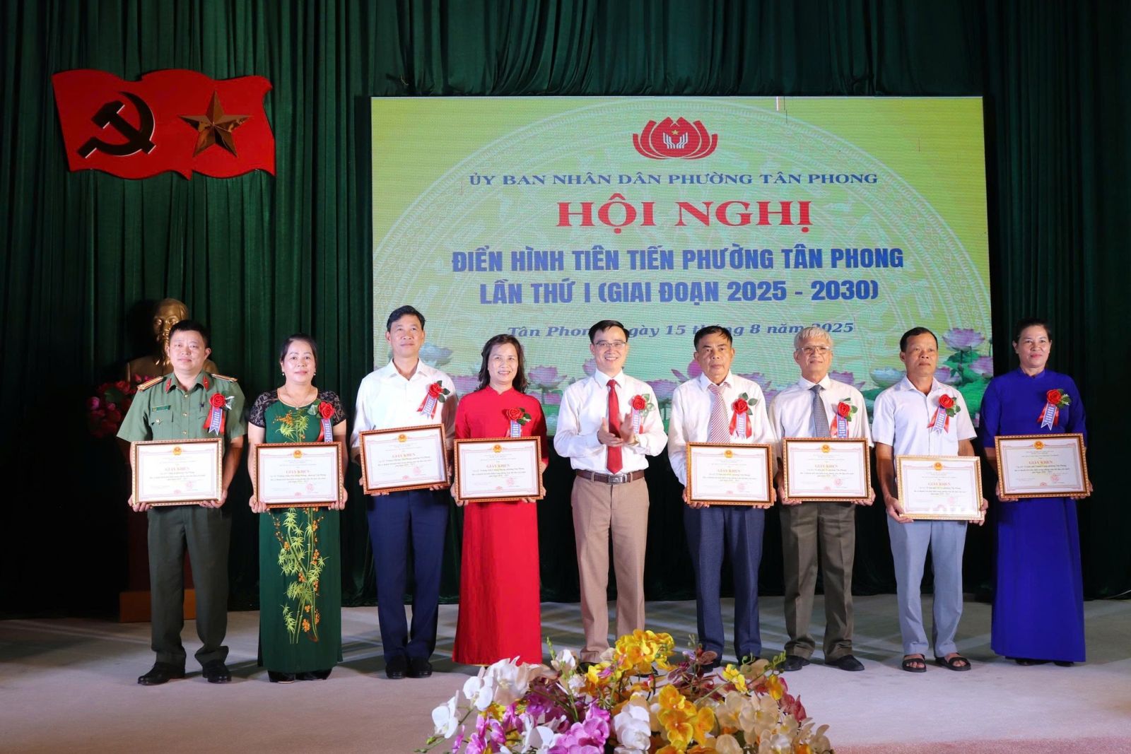 Nhân dịp này, UBND phường Tân Phong đã biểu dương, khen thưởng 9 tập thể, 26 cá nhân và 11 hộ gia đình tiêu biểu trong phong trào thi đua yêu nước giai đoạn 2020 – 2025; đồng thời phát động phong trào thi đua giai đoạn 2025 – 2030 với mục tiêu gắn phát triển kinh tế - xã hội với giảm nghèo bền vững, nâng cao đời sống Nhân dân. Trong đó, trọng tâm là phát triển thương mại, dịch vụ, du lịch và sản xuất nông nghiệp chất lượng cao, phấn đấu xây dựng phường Tân Phong trở thành đô thị xanh, sạch, đẹp, mang đậm bản sắc văn hoá các dân tộc.